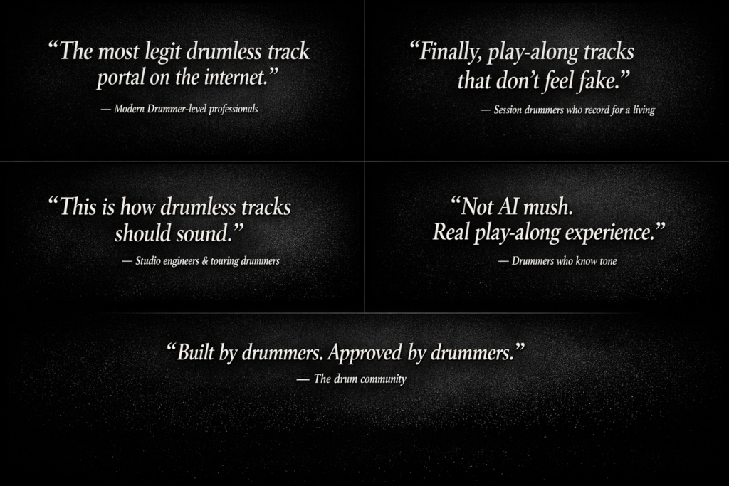 Play along with real songs using professional drumless tracks. Over 7,000 drumless tracks made from original masters. Library Play Along With Real Songs — Using Your Own Drums Drumless Version lets you play real music without drum tracks, so you can practice, record, or perform using your own drum kit — acoustic or electronic. How It Works The World’s Most Complete Drumless Track Library7,000+ songs • Original Masters • All GenresPlay, practice, or record your own drums with studio-quality tracks. Unlock the Library Forever. One-time payment, lifetime access + All future updates will be free. Only for USD 53.00 Order Now Access over 7,000 high-quality drumless tracks made directly from original master recordings. All drum channels are fully removed, giving you the freedom to play, practice, and record your own drums—just like you’re in the studio with your favorite artists. Samples Always Ready.Built for today’s drummers — not yesterday’s tracks.Constantly updated grooves for real practice, recording & creativity.Drumless Version never stops working for your playing. A living library that evolves with modern drummers.Fresh, usable, always updated drumless tracks.This is Drumless Version. Updates Today’s pick February 2026 Update is Live – New Drumless Tracks Added You can access new songs from the UPDATES folder ABC – Poison Arrow ABC – Show me Alice In Chains – Dont Follow Anthrax – For All Kings Arch Enemy – The Eagle Flies Alone Arch Enemy – The World Is Yours Arch Enemy – War Eternal Baltimora – Tarzan Boy BAP – Kristallnaach BAP – Südstadt Verzäll Nix BAP – Verdamp lang her BAP – Waschsalon BAP – Zehnter Juni Beyond The Black – Lost In Forever Chris de Burgh – Dont Pay The Ferryman Die Toten Hosen – Alles aus Liebe Die Toten Hosen – Azzuro Ella Langley – Choosin Texas Ernest – Would If I Could (feat. Lainey Wilson) Fischer Z – Berlin Fischer Z – In England Fischer Z – Marliese Fischer Z – Red Skies Over Paradise Fleetwood Mac – Dreams Foreigner – Break it up Foreigner – Growing Up The Hard Way Foreigner – Night life Foreigner – Tooth And Nail Gary Moore – Moving On Gary Moore – Over the Hills and Far Away Genesis – Squonk HammerFall – (r)Evolution HammerFall – Hectors Hymn Hudson Westbrook – House Again Iron Maiden – Revelations Jake – 1. She caught the Katy Jason Aldean – Big Green Tractor Jon Pardi – Dirt On My Boots Led Zeppelin – Carouselambra Led Zeppelin – Custard Pie Lindsay Lohan – Ultimate Luke Combs – The Kind of Love We Make Lynyrd Skynyrd – Workin For MCA Marilyn Manson – This Is the New Shit McAuley Schenker Group – Dont Stop Me Now McAuley Schenker Group – Here Today Gone Tomorrow McAuley Schenker Group – No Time For Losers Metal Church – Beyond The Black Metal Church – Metal Church Michael Jackson – Another Part Of Me Michael Jackson – Blame It On The Boogie Michael Jackson – Blood On The Dancefloor Michael Jackson – Can You Feel It Michael Jackson – Cant Let Her Get Away Michael Jackson – Come Together Michael Jackson – Dangerous Michael Jackson – Ghosts Michael Jackson – Heal The World Michael Jackson – Human Nature Michael Jackson – I Just Cant Stop Loving You Michael Jackson – In The Closet Michael Jackson – Jam Michael Jackson – Keep The Faith Michael Jackson – Leave Me Alone Michael Jackson – Liberian Girl Michael Jackson – Off The Wall Michael Jackson – Remember The Time Michael Jackson – Shake Your Body Michael Jackson – She Drives Me Wild Michael Jackson – Stranger In Moscow Michael Jackson – The Girl Is Mine Michael Jackson – They Dont Care About Us Michael Jackson – Wanna Be Starting Something Michael Jackson – Who Is It (7 Edit) Michael Jackson – Why You Wanna Trip On Me Michael Jackson – Will You Be There Michael Jackson – You Are Not Alone Michael Jackson – You Rock My World Miranda Lambert Chris Stapleton – A Song to Sing Mittermeier Vs. Guano Babes – Kumba Yo! Morgan Wallen – I Got Better Moti Special – Cold Days, Hot Nights Nickelback – Animals Nickelback – Feeling Way Too Damn Good Nightwish – The Kinslayer Paul McCartney – Say Say Say (feat. Michael Jackson) Pearl Jam – Animal Preston Cooper – Weak Puddle of Mudd – Control Rainbow – A Light In The Black Rainbow – Stargazer Rod Stewart – Da Ya Think Im Sexy Rodgau Monotones – Frach mich net Rodgau Monotones – Volle Lotte! Saga – Amnesia Saga – Cat Walk Saga – Climbing The Ladder Saga – Compromise Saga – How Long Saga – Its Time! (Chapter Three) Saga – See Them Smile Saga – Slow Motion Saga – The Flyer Saga – The Sound Of Strangers Saga – The Writing Saga – Time To Go Saga – Whats It Gonna Be Saga – Will It Be You Scorpions – Bad Boys Running Wild Scorpions – Cant Live Without You Scorpions – Dont Stop At The Top Slade – Night Starvation Slade – Well Bring The House Down Spider Murphy Gang – Schickeria Status Quo – Backwater Status Quo – Unspoken Words Steve Winwood – Higher Love Stevie Ray Vaughan And Double Trouble – The House Is Rockin T Rex – Jeepster T Rex – Telegram Sam Texas Lightning – No No Never The Beatles – Let It Be The Blues Brothers – (I Got Every Thing I Need) Almost The Blues Brothers – Do You Love Me The Blues Brothers – Hey Bartender The Blues Brothers – Messin With The Kid The Blues Brothers – Rubber Biscuit The Blues Brothers – Soul Finger The Blues Brothers – Whos making Love The Marcels – Blue Moon The Offspring – Defy You The Smashing Pumpkins – Rocket Thin Lizzy – Dont Believe A Word Thunder – Gimme Shelter Triumph – All The Kings Horses Triumph – Headed For Nowhere Triumph – Never Say Never Uriah Heep – Traveller In Time Van Halen – Good Enough Van Halen – Mine All Mine Warning – Commando Warning – Rock City Why drummers choose Drumless Version Drummer-focused only No gen